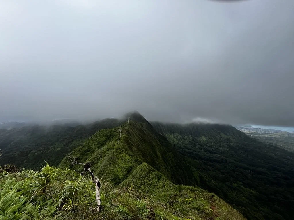 Panoramiczny widok na zielony grzbiet górski na Hawajach, znikający w chmurach – uchwycony podczas wędrówki z lokalnym przewodnikiem Mana Adventure.